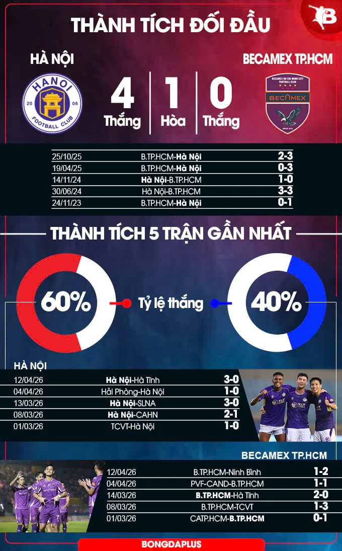 Thống kê từ mùa giải 2022 đến nay cho thấy một chuỗi thành tích ảm đạm của Becamex TP.HCM trước Hà Nội: 6 lần thua và chỉ 2 lần cầm hòa. Với lợi thế về chuyên môn và đội hình vượt trội, Hà Nội được dự báo sẽ không dễ dàng để đối thủ rời đi với bất kỳ điểm số nào.