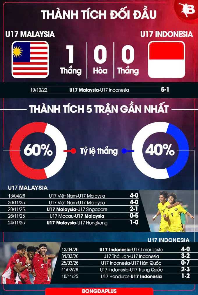 Nhìn lại lịch sử đối đầu, U17 Malaysia từng có chiến thắng đậm 5-1 trước Indonesia tại vòng loại U17 châu Á 2022. Tuy nhiên, bức tranh hiện tại đã thay đổi. U17 Indonesia trong những năm gần đây có sự đầu tư bài bản cho lứa trẻ, thường xuyên được cọ xát ở các đấu trường quốc tế và cho thấy sự tiến bộ rõ rệt. Điều này hứa hẹn một trận cầu cân não và khó lường.